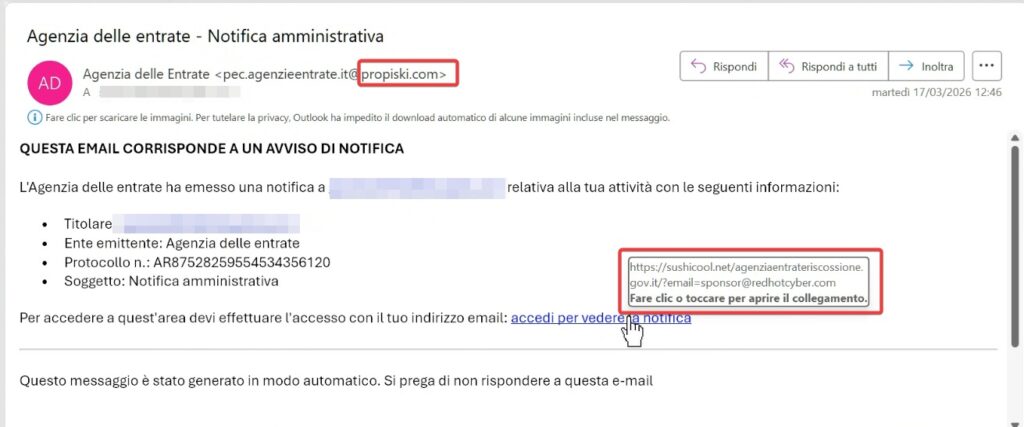 Il dominio utilizzato, infatti, è @propiski.com, un suffisso che non ha alcun legame con i canali ufficiali dell’Agenzia delle Entrate o di Sogei. Anche i link interni contenuti nel corpo del testo rimandano a siti esterni sospetti (come sushicool.net), progettati per carpire dati sensibili o installare malware.