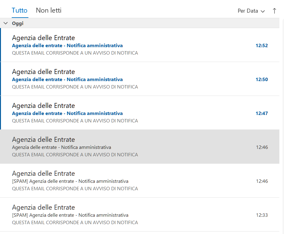 Ciò che rende questa campagna particolarmente insidiosa non è solo il contenuto, ma una curiosa anomalia tecnica osservata nei sistemi di posta elettronica. Abbiamo rilevto che i criminali inviano numerose email identiche a brevi intervalli di tempo.