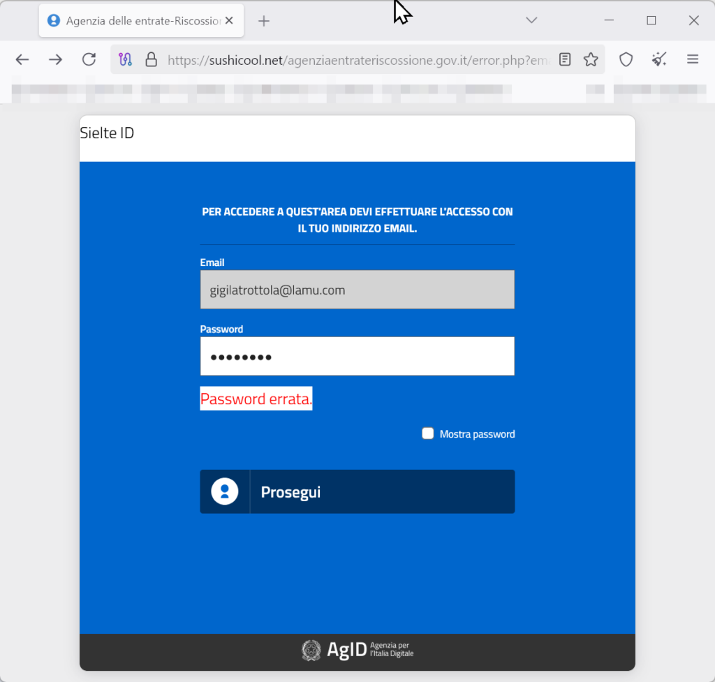 La pagina di atterraggio è una copia quasi perfetta di un portale istituzionale, completa di loghi dell’AgID (Agenzia per l’Italia Digitale) e un modulo di login che richiede email e password.