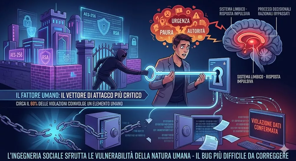Un esame delle dinamiche dell’ingegneria sociale rivela una verità fondamentale: il campo di battaglia della sicurezza informatica si è spostato dai server dei computer al cervello umano. Urgenza, autorità e paura non sono semplici stampelle! Sono strumenti di precisione che manipolano l’architettura biologica del nostro cervello. Il fatto che anche gli esperti siano vulnerabili dimostra che la conoscenza tecnica non può superare milioni di anni di evoluzione che ci hanno predisposto a rispondere istintivamente a determinati stimoli emotivi.