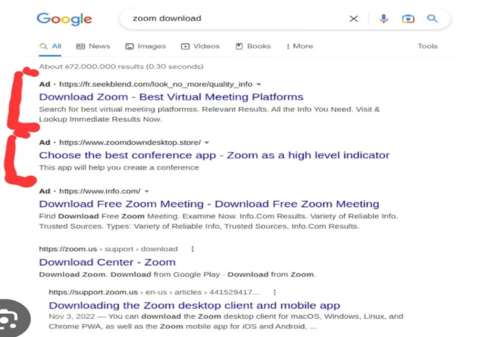 Creando siti compromessi che appaiono tra i primi risultati di ricerca per software popolari, gli attaccanti riescono a indurre gli utenti a scaricare malware sotto mentite spoglie di programmi legittimi come Zoom o TeamViewer.