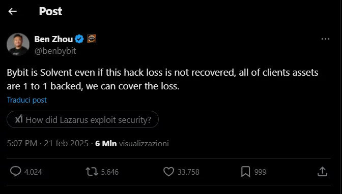 Il CEO di Bybit Ben Zhou ha dichiarato che Bybit è solvibile e sarà in grado di coprire tutte le perdite.