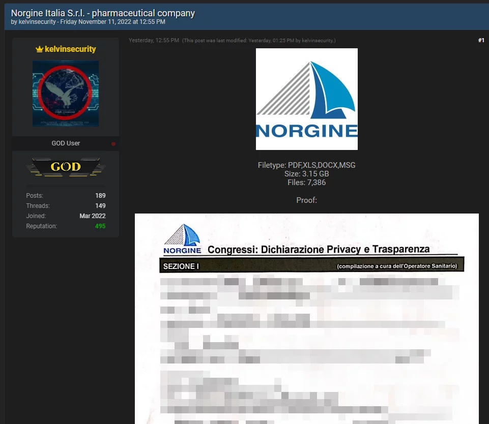 E’ stato pubblicato recentemente, all’interno del famigerato forum di criminali informatici Breach Forums, un post della cybergang Kelvin Security che rivendica un attacco informatico ad una azienda italiana, la Norigine Italia.