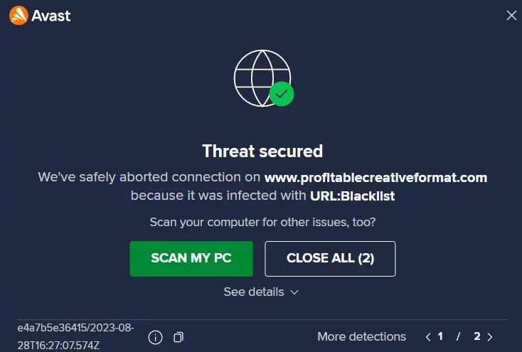 Messaggio dell’antivirus AVAST al momento della visita al sito salute.lazio.it