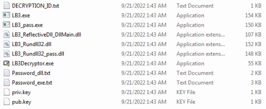 Il post ripubblicato in rete da altri profili mostra 4 immagini che raffiguravano i file appartenenti alla cybergang LockBit con una serie di eseguibili e librerie DLL collegate, oltre a dei file di configurazione.