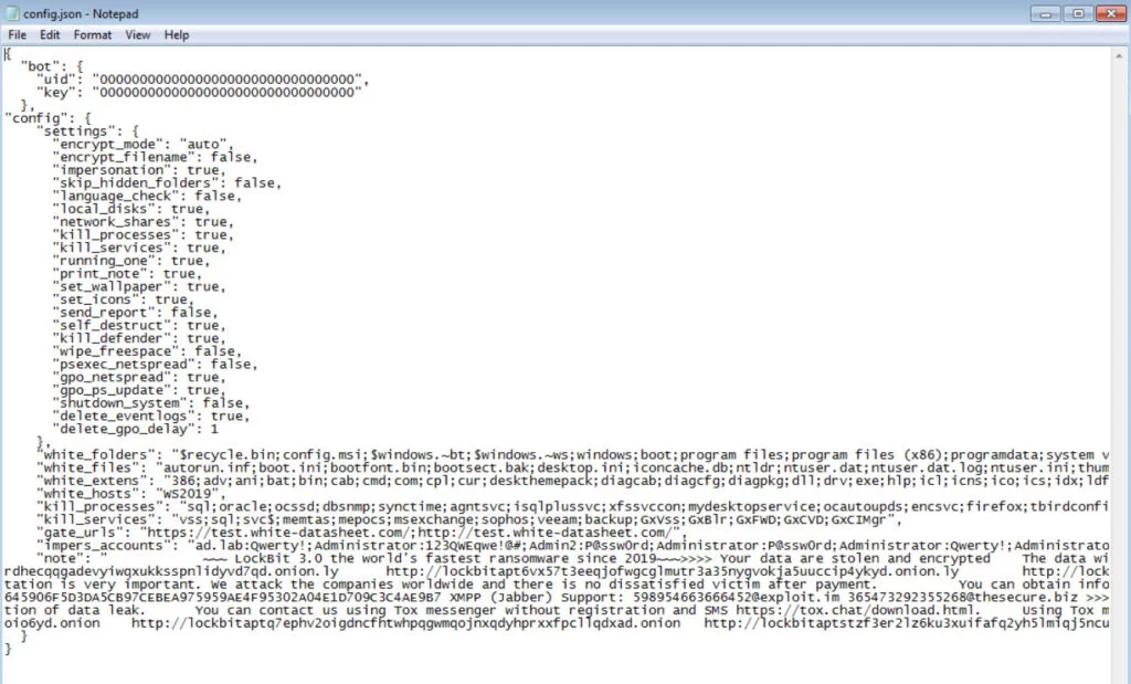 Andando ad aprire il file config.json, ci troviamo di fronte ad un classico file di configurazione presumibilmente di uno dei binari di LockBit che riporta una serie di parametri da utilizzare dal malware.