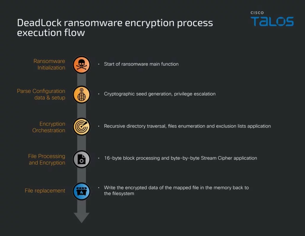 Secondo Talos gli attacchi vengono eseguiti da un operatore motivato finanziariamente che ottiene l’accesso all’infrastruttura della vittima almeno cinque giorni prima della crittografia e prepara gradualmente il sistema per l’implementazione di DeadLock.