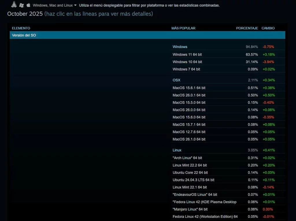 All’interno del mondo Linux, la distribuzione più diffusa tra i gamer è SteamOS, che rappresenta il 27,18% degli utenti Linux su Steam. Seguono Arch Linux con il 10,32%, Linux Mint 22.2 con un significativo aumento del 6,65% e Bazzite, una distribuzione ottimizzata per il gaming che sta rapidamente guadagnando consensi.