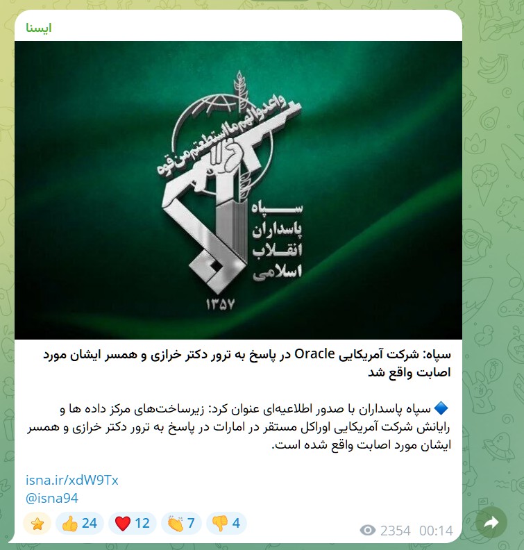 “Il data center e l’infrastruttura informatica dell’azienda statunitense Oracle, con sede negli Emirati Arabi Uniti, sono stati colpiti in risposta all’assassinio del dottor Kharrazi e di sua moglie.”