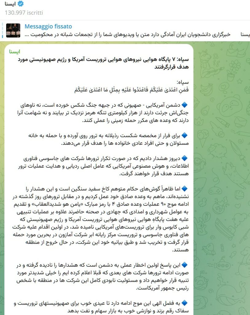 In questo quadro si inserisce un messaggio diffuso attraverso canali affiliati all’IRGC, in cui si afferma: