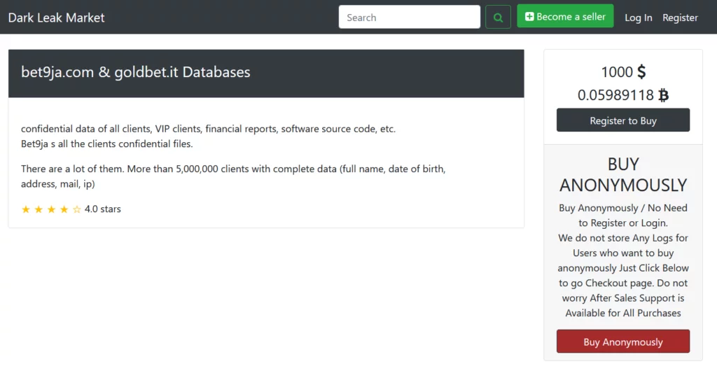 Su un noto forum underground è stata rilevata nella giornata di oggi, un post che riporta la messa in vendita dei dati di due portali di gioco “bet9ja.com | goldbet.it”, dove il secondo è il famoso portale di scommesse italiane di Lottomatica.