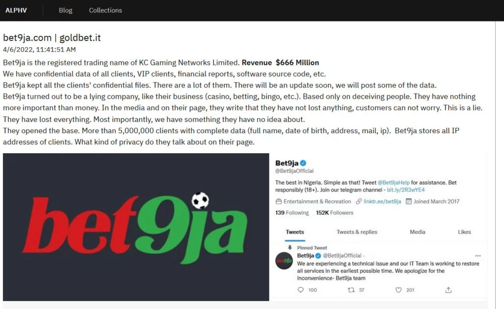 Hanno aperto la base. Più di 5.000.000 di clienti con dati completi (nome completo, data di nascita, indirizzo, mail, ip). Bet9ja memorizza tutti gli indirizzi IP dei clienti. Di che tipo di privacy parlano sulla loro pagina.A questo punto, già all’epoca dell’attacco di ALPHV la situazione era poco chiara.