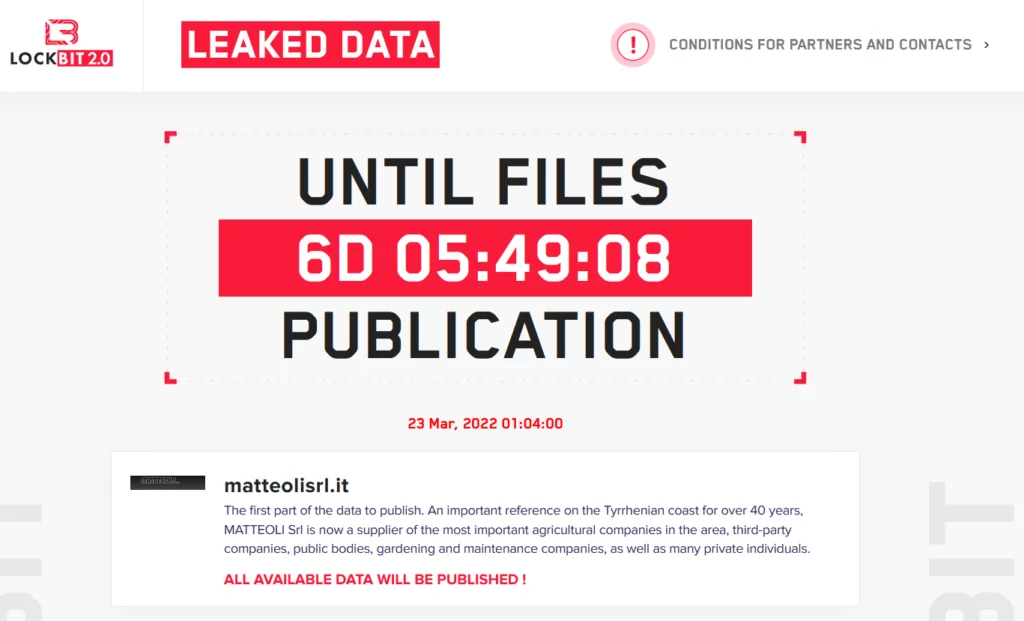 Questa volta sul data leak site di LockBit 2.0, viene riportata l’azienda italiana Matteoli S.r.l. con un countdown fissato al 23 di Marzo, data di quando verranno pubblicati i 2840 file esfiltrati dalle sue infrastrutture IT.