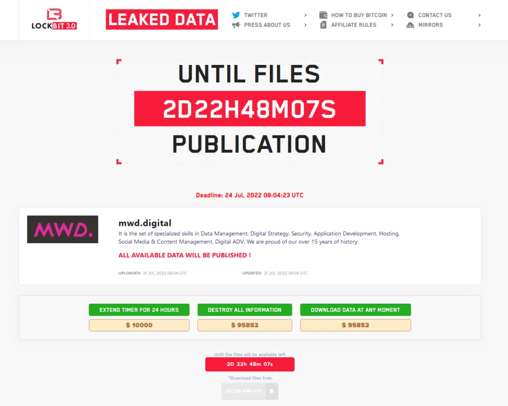 LockBit 3.0 questa volta non pubblica dei samples ma avvia il consueto “countdown” fissato a 2gg, data della pubblicazione dei dati esfiltrati nelle underground, ovvero il 24 luglio alle 04:23 orario UTC.