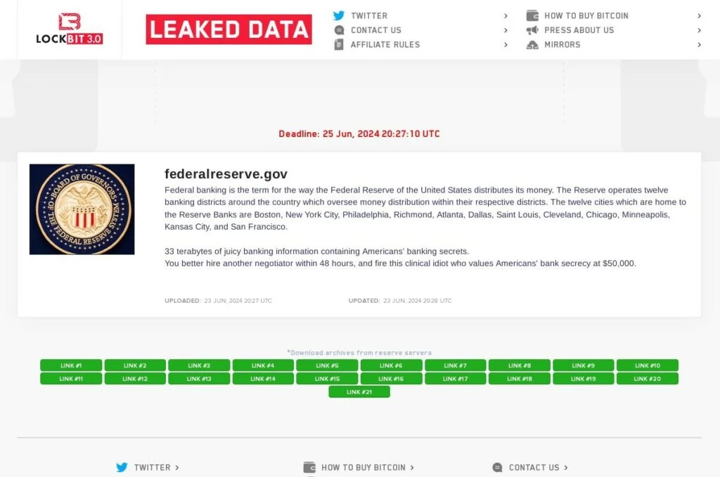 Recentemente, LockBit ha dichiarato di aver condotto un attacco di doppia estorsione contro la Federal Reserve, l’istituzione finanziaria centrale degli Stati Uniti. Questo annuncio ha immediatamente attirato l’attenzione dei media e degli esperti di sicurezza informatica, data l’importanza e la sensibilità dell’obiettivo.