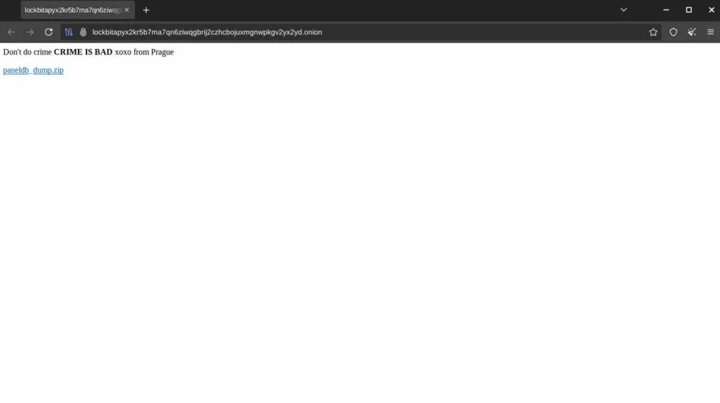La scorsa notte, il gruppo ransomware LockBit ha subito un grave attacco informatico che ha compromesso la sua infrastruttura nel dark web. Gli affiliati e gli amministratori del gruppo hanno trovato i loro pannelli di controllo compromessi e le home modificate con il messaggio: “Don’t do crime CRIME IS BAD xoxo from Prague”, accompagnato da un link per scaricare un file denominato “paneldb_dump.zip” contenente un dump del database MySQL del gruppo.