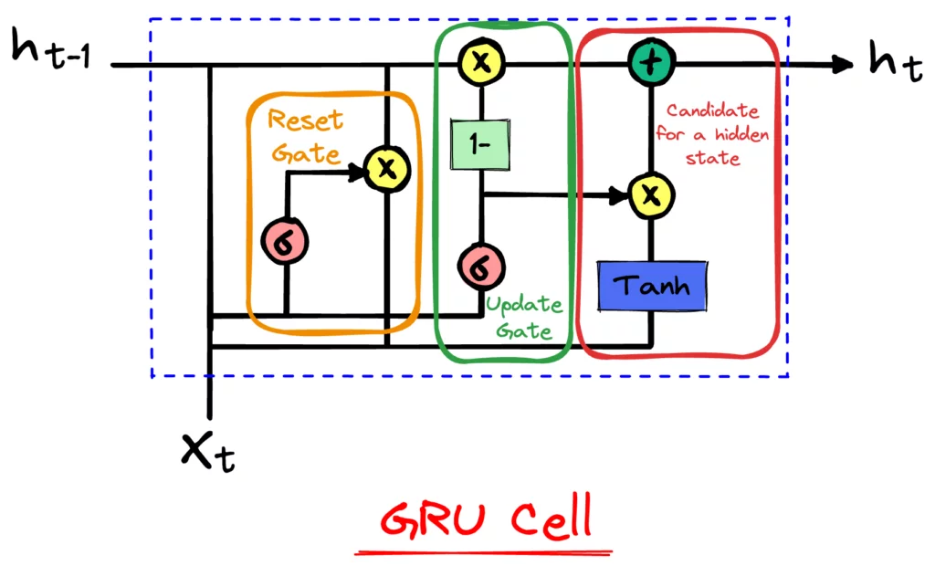 Le GRU hanno una struttura simile alle LSTM, ma con solo due gate: il gate di reset e il gate di update.