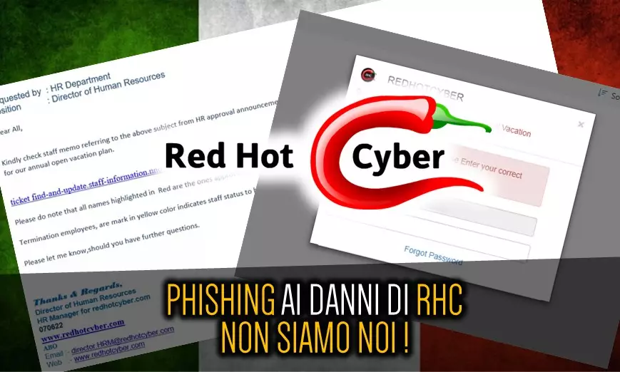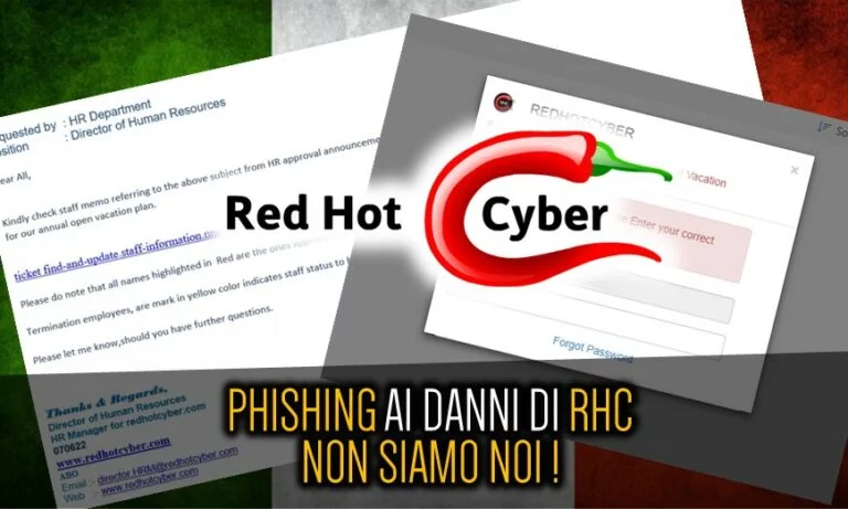 Tale mail, simulava il dipartimento di Human Resource di Red Hot Cyber (che non esiste) la quale viene indirizzata ai suoi dipendenti (che non esistono) chiedendo di eseguire delle azioni su un sito ovviamente fake per approvare un piano ferie.