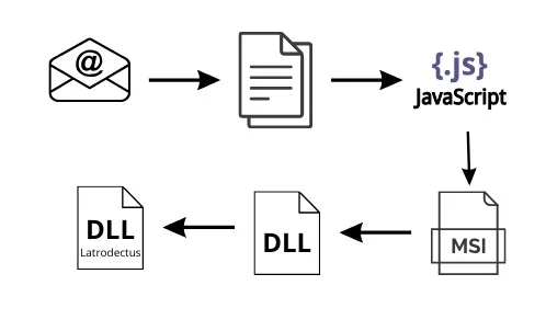 La diffusione avviene tramite l’invio di email contenenti documenti malevoli, camuffati da contenuti legittimi, con l’obiettivo di ingannare l’utente target. Accedendo al documento, l’utente viene reindirizzato a un URL malevolo, dal quale viene scaricato il payload di attacco, spesso costituito da un file Javascript di grandi dimensioni a causa delle tecniche di offuscamento utilizzate. Questo file Javascript ha il compito di scaricare un file MSI, che a sua volta installa le librerie DLL necessarie per la decompressione della DLL di Latrodectus. Questa DLL permette il collegamento al server C2 (Command and Control) dell’attaccante.