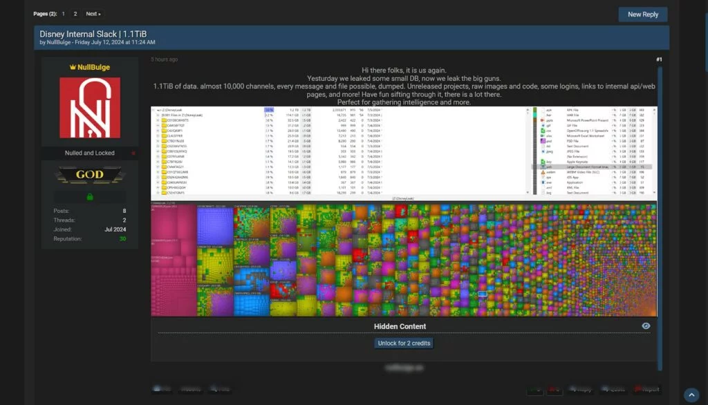 In un forum di hacking, un attore malevolo ha recentemente dichiarato di aver avuto accesso al sistema interno di Slack di Disney, compromettendo un’enorme quantità di dati pari a 1,1 TiB. Questa ingente quantità di informazioni include progetti non ancora rilasciati, immagini grezze, codice sorgente, informazioni di accesso critiche, API interne, link a pagine web e messaggi e file provenienti da ben 10.000 canali.