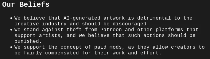 Il gruppo si basa su convinzioni ben spiegate nella home page del loro sito, dove dichiarano di essere contrari all’arte generata dall’intelligenza artificiale, ritenendola dannosa per gli artisti. Si oppongono al furto di contenuti da piattaforme come Patreon e altre che supportano gli artisti e sostengono il concetto di modifiche a pagamento nei giochi (mod a pagamento), poiché consentono ai creatori di essere equamente compensati per il loro lavoro e impegno.