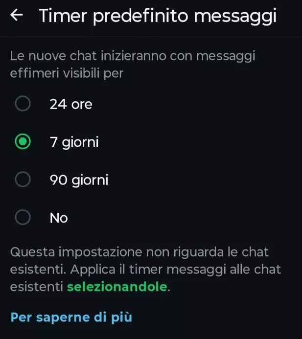 Per attivare i messaggi effimeri andare su “Impostazioni“, selezionare “Privacy“, scorrere leggermente verso il basso fino a trovare “Messaggi Effimeri” e cliccare su “Timer predefinito messaggi”. Comparirà la seguente schermata dalla quale sarà possibile selezionare la durata delle informazioni presenti nella chat. Tale possibilità è abilitabile anche dalla versione WhatsApp Web.