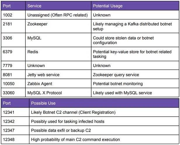 La botnet è controllata tramite 6 server C2 situati nell’infrastruttura del provider americano Shark Tech e il traffico passa attraverso gli hosting UCLOUD HK (Hong Kong) e CDS Global Cloud (Cina). I server C2 sono basati su Apache Zookeeper e Kafka e il fuso orario del sistema è impostato su Asia/Shanghai. I registri di uptime mostrano che la botnet è attiva da dicembre 2024.