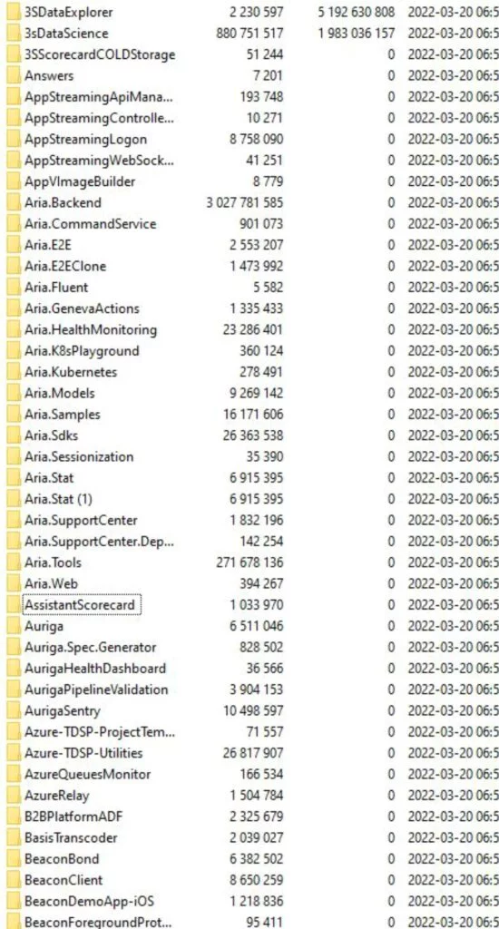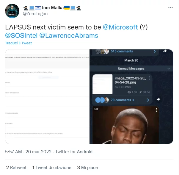 La prova dell’hacking è emersa domenica sera quando Tom Malka ha pubblicato schermate su Twitter che mostravano una conversazione di Telegram che sembra essere un elenco di cartelle interne del repository di codice sorgente di Microsoft.