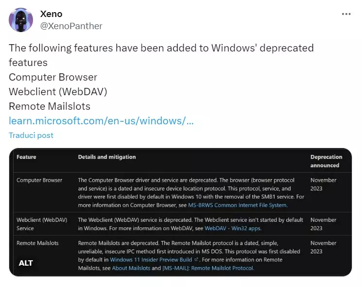 Il primo ad accorgersi dell’imminente disattivazione di tre funzioni in Windows è stato un utente con il nickname @XenoPanther. Ha condiviso le informazioni in un post sulla piattaforma X (precedentemente nota come Twitter). Quindi la notizia è stata ripresa e trattata dalla popolare pubblicazione IT XDA Developers.