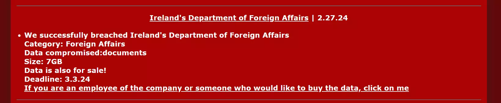 Sul suo sito web, il gruppo Mogilevich ha annunciato la vendita di 7 GB di documenti DFA rubati, senza fornire prove di pirateria informatica. Oltre al dipartimento irlandese, sul sito di Mogilevich sono elencate altre 3 vittime, i cui nomi non vengono resi noti a causa della mancanza di commenti da parte di queste società. Non sono state presentate prove di altri hack.