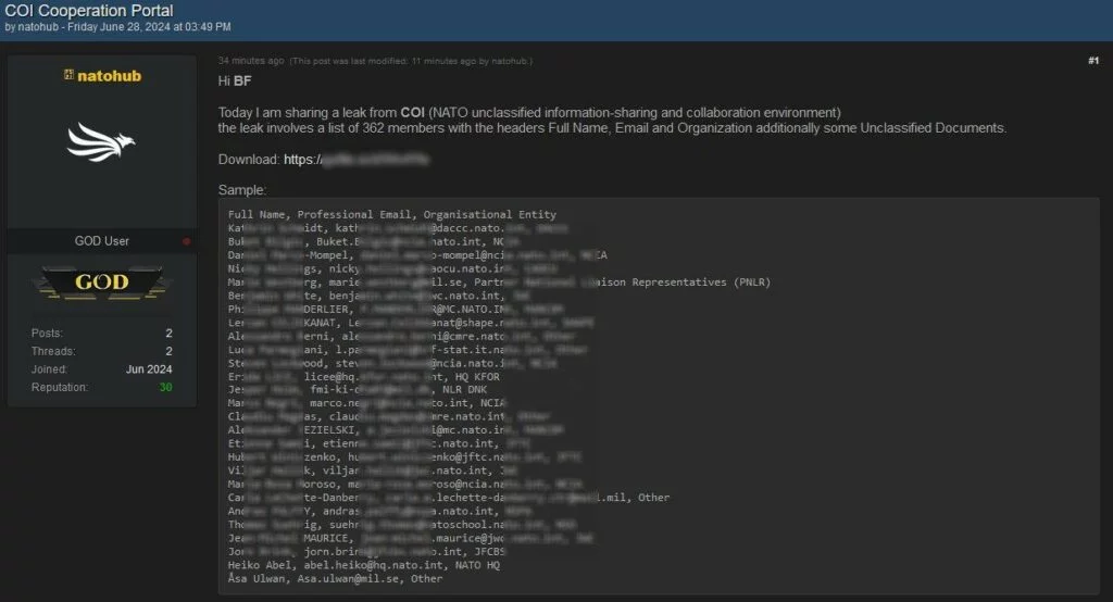 Poco fa, un attore malevolo ha diffuso dati sensibili presumibilmente appartenenti al COI, un ambiente di condivisione e collaborazione delle informazioni non classificate della NATO.