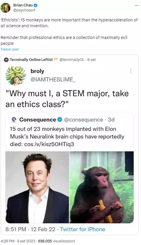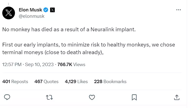 Musk ha riconosciuto per la prima volta la morte dei macachi il 10 settembre in una risposta ad un utente del social media X.