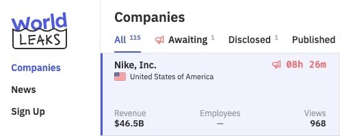 Gli hacker affermano di aver violato i dati di Nike il 22 gennaio e di aver rubato 188.347 file per un totale di circa 1,4 TB.