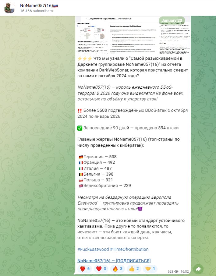 Il dato emerge da un post pubblicato sul canale Telegram ufficiale di NoName057(16), nel quale il gruppo rilancia informazioni tratte da un report della società di monitoraggio DarkWebSonar. Nel messaggio, il collettivo rivendica un’attività incessante e sistematica, auto-definendosi apertamente come il “re del terrore DDoS quotidiano”.