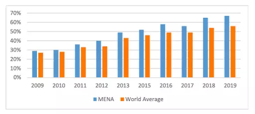 Ultimo ma non meno importante, secondo l’economista Franklin Allen, nelle regioni MENA ci sono stati importanti sviluppi correlati riguardanti il cambiamento nella struttura finanziaria: la globalizzazione della finanza – che ha ridotto le barriere consentendo finanziamenti – e il fintech, che abilita le tecnologie informatiche nei servizi bancari e finanziari nelle nazioni ad alto reddito – Bahrain, Kuwait, Oman, Qatar, Arabia Saudita e Emirati Arabi Uniti – e medio reddito, Algeria, Egitto, Iraq, Giordania, Libano, Marocco e Tunisia, dove però solo una parte della popolazione ha accesso a Internet. Una divisione che sottolinea anche la disparità nelle capacità cibernetiche (alte in Qatar, Emirati Arabi Uniti, e Saudi Arabia, basse in Yemen, Iraq e Libia).