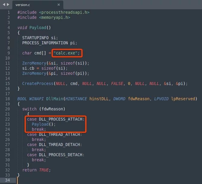 In questo caso usiamo lo script sottostante per generare una nuova DLL dove nel MAIN è presente un payload che verrà avviato.