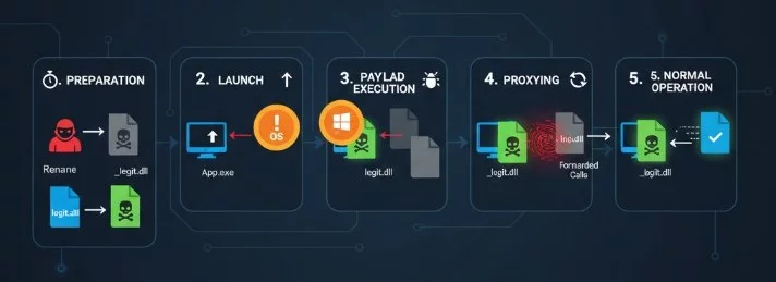 In sostanza, un aggressore induce un’applicazione legittima a caricare ed eseguire una DLL malevola al posto della DLL originale e attesa.