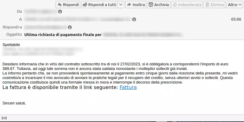 L’e-mail, che dalle prime ore del mattino è stata recapitata a numerose caselle di posta elettronica certificata, invita i destinatari a cliccare sul link presente nel corpo del messaggio al fine di scaricare una fantomatica fattura.