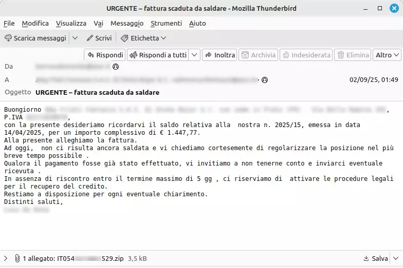 invece del consueto link ipertestuale sulla parola “Fattura“, l’email presenta ora un file ZIP allegato;