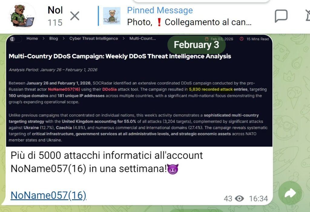 Il collettivo hacktivista filorusso NoName057(16) è tornato recentemente a colpire infrastrutture e siti web europei, con una nuova ondata di attacchi DDoS che coinvolge direttamente anche l’Italia. Lo stesso gruppo, attraverso il proprio canale Telegram, nelle ultime ore a rivendicato una serie di vittime.