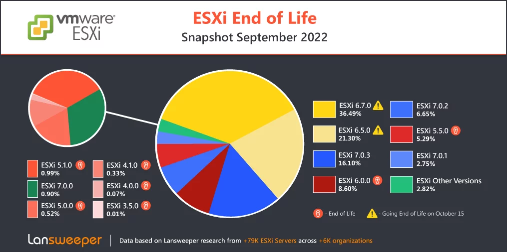 Si tratta di ben 45.000 server VMware ESXi inventariati da Lansweeper che hanno appena raggiunto la fine del ciclo di vita (EOL), a meno che le aziende non acquistino un contratto di supporto esteso.