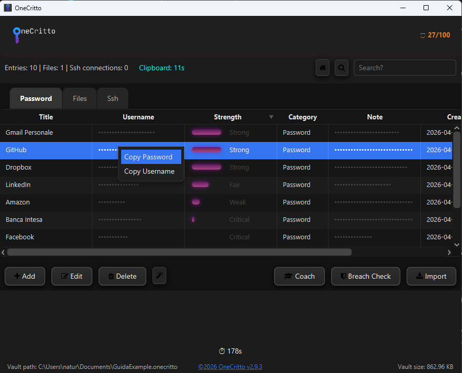 Dal punto di vista funzionale, OneCritto estende il concetto di password manager verso un secure vault multiuso. Oltre alle credenziali, permette anche la gestione di note cifrate e chiavi SSH, che vengono decifrate solo al momento della connessione e mai archiviate in chiaro. Questo lo rende adatto a contesti professionali e DevOps, dove la gestione sicura delle chiavi diventa critica.