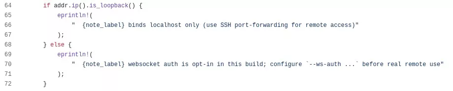 Leggendo il codice, il CERT-AgiD ha compreso che il sistema è consapevole dei rischi legati all’esposizione diretta nella rete. Quando l’esposizione del servizio è limitata ad una interfaccia di loopback, viene suggerito l’utilizzo di canali protetti.