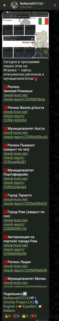 Le informazioni sugli attacchi effettuati da NoName057(16) sono pubblicate nell’omonimo canale di messaggistica di Telegram. Secondo i media ucraini, il gruppo è anche coinvolto nell’invio di lettere di minaccia ai giornalisti ucraini. Gli hacker hanno guadagnato la loro popolarità durante una serie di massicci attacchi DDOS sui siti web lituani.