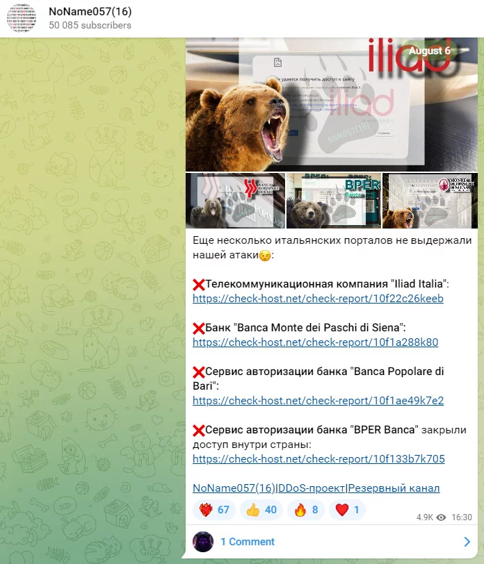 Ancora non sappiamo se i cannoni DDoS del progetto DDosia risulti puntato ancora sull’Italia, ma intento riportiamo le ultime vittime italiane della giornata di ieri. NoName057(16) colpisce di nuovo bance e telecomunicazioni nelle attività pomeridiane.