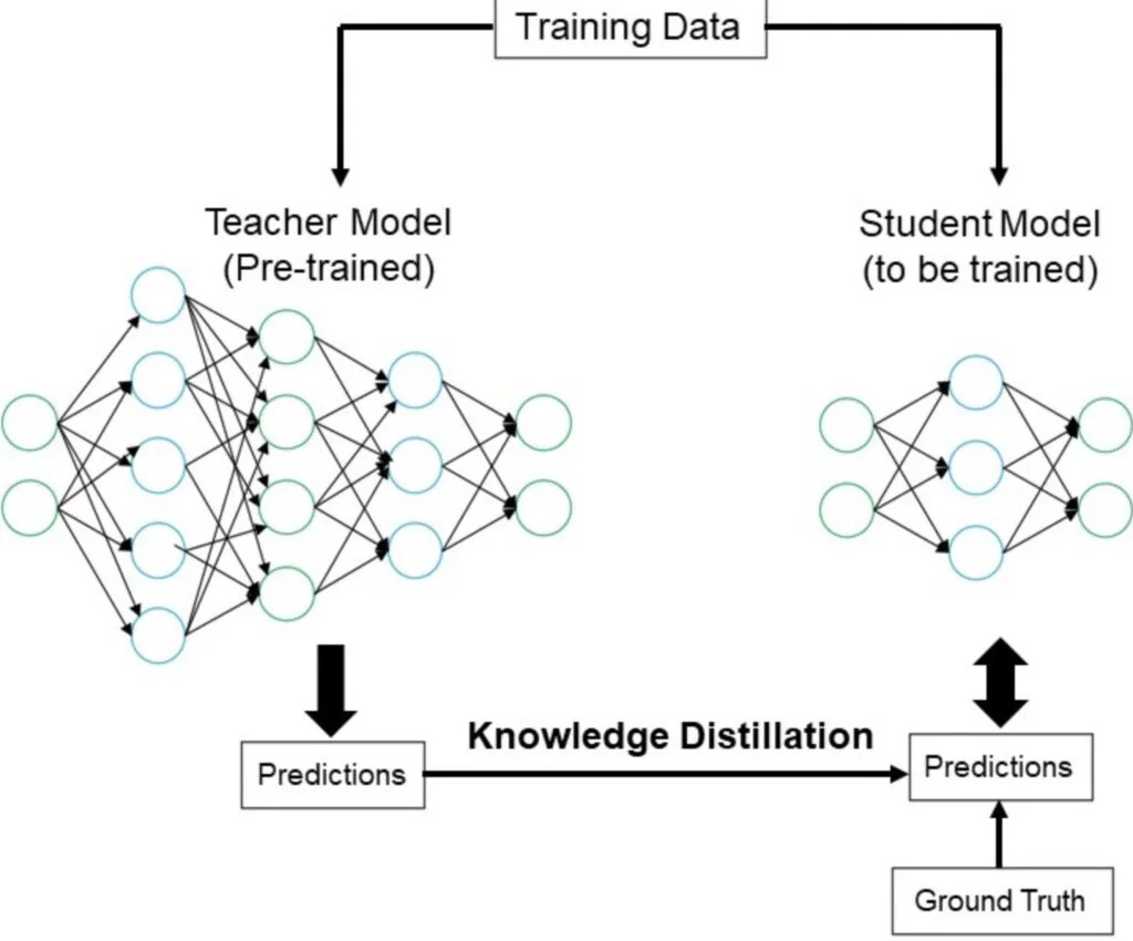 L’idea è quella di avere un modello grande, chiamato teacher (insegnante), e un modello più piccolo, chiamato student (studente), e di utilizzare le conoscenze dell’insegnante per insegnare allo studente cosa prevedere. In questo modo possiamo mettere in produzione solamente lo studente.