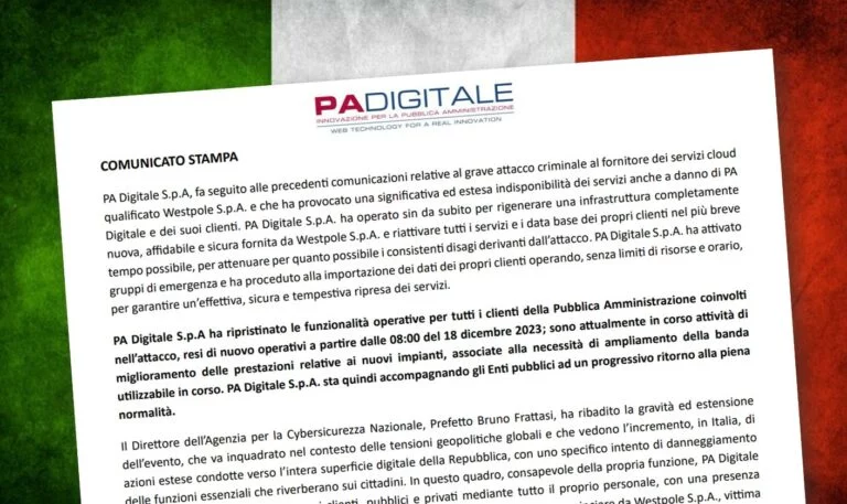 Pieve Fissiraga, 19 dicembre 2023 – PA Digitale S.p.A., fornitore di servizi digitali, sta affrontando con determinazione e tempestività le conseguenze di un grave attacco informatico al fornitore di servizi cloud Westpole S.p.A. come visto negli articoli scorsi.