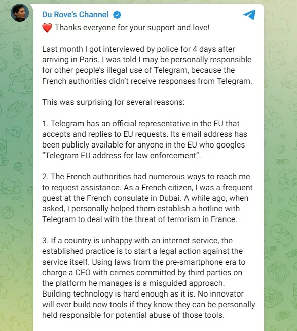 Pavel Durov ha pubblicato un ampio post sul suo canale Telegram dedicato alla sua recente detenzione in Francia e alle accuse mosse contro di lui. Durov ha ringraziato tutti per il supporto e ha raccontato come Telegram sta combattendo i contenuti illegali.