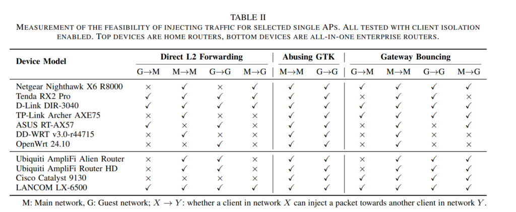 E ancora, la sincronizzazione dell’identità di un client attraverso lo stack di rete non sempre è robusta. Questo apre la porta a bypass dell’isolamento a livello di rete, permettendo di intercettare traffico in uplink e downlink, anche verso dispositivi interni o backend. Tutte le reti e i router analizzati mostravano almeno una vulnerabilità.